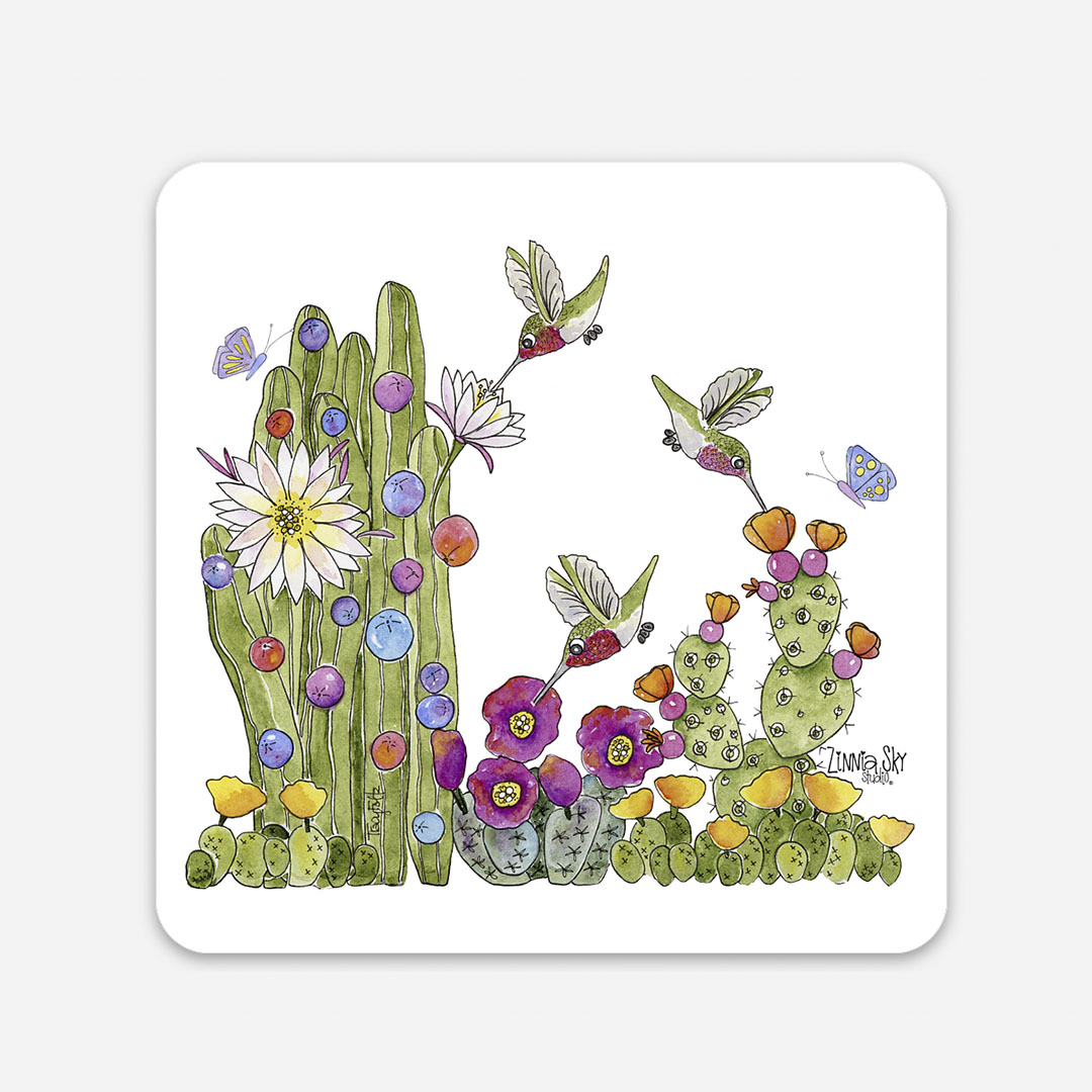 Bright blooms and tiny wings come together in this cheerful 3″ x 3″ vinyl sticker with rounded corners. A cluster of colorful cactus blossoms takes center stage while hummingbirds flit and hover all around. The design is lively, bold, and ready to add a splash of joy wherever it sticks.