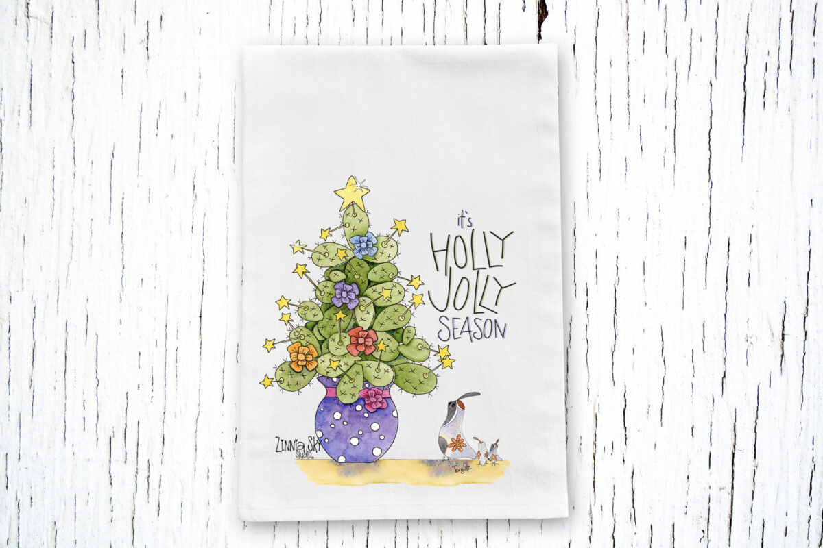 Add some festive Southwest charm to your holidays with our Cactus Holly Jolly Tea Towel! This holiday-themed towel features a festive prickly pear cactus potted up as a holiday tree, making it a fun and unique addition to any kitchen. With the words It’s Holly Jolly Season, it’s perfect for spreading holiday cheer. This 100% cotton tea towel is both decorative and functional, with high-quality prints that wonโt fade or peel. Whether for drying dishes or adding a touch of holiday spirit, this towel is a must-have for your home this season and many more to come!