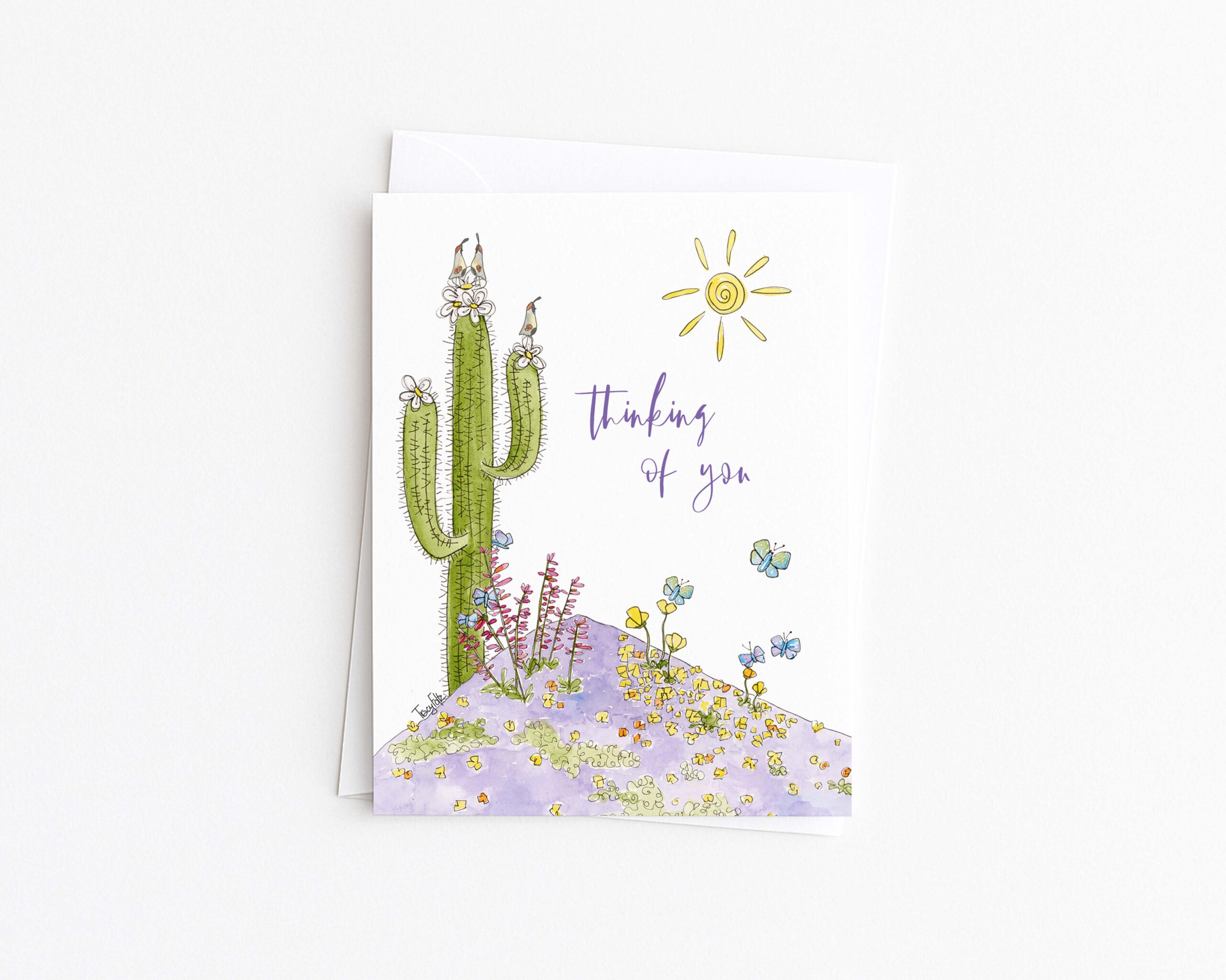 Flowers and butterflies cover purple desert meadows in the spring and it’s an amazing sight to see. ย A simple desert hillside normally without a lot of color suddenly bursts into color and transforms the ordinary into extraordinary! ย Let someone know you’re thinking of them with this colorful, happy desert card.