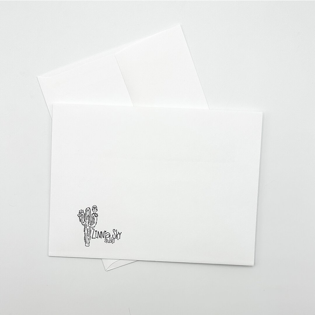 - It includes a bright white matching envelope with the Zinnia Sky Studio imprint on the front.