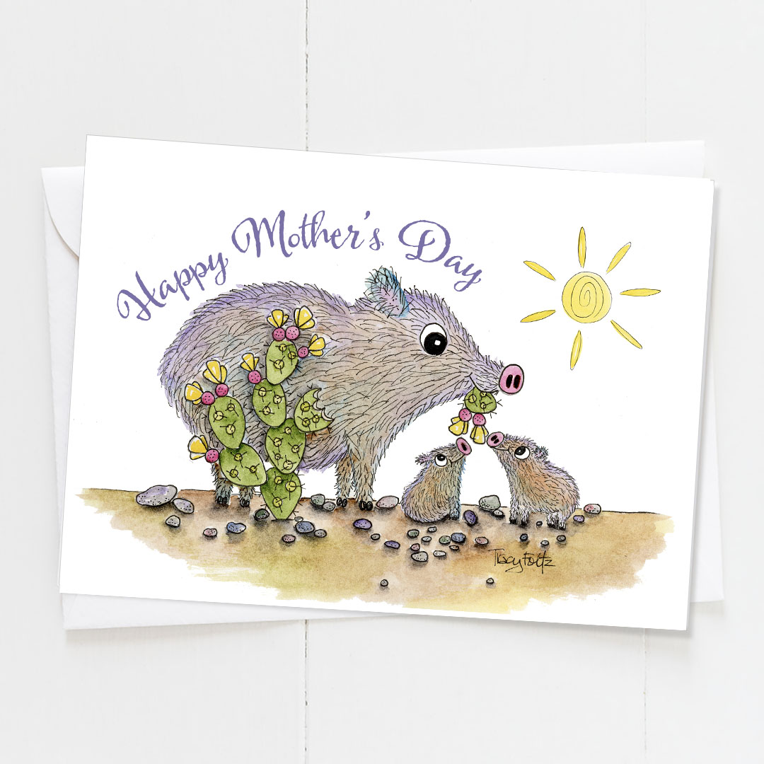 Javelina Babies Flowers. This javelina mama is sharing her prickly pear deliciousness with her most special babies. Send this sweet desert Mother’s Day card to all your favorite moms and stand-in moms. Show your love and make them smile. Blank inside because your words are best.
