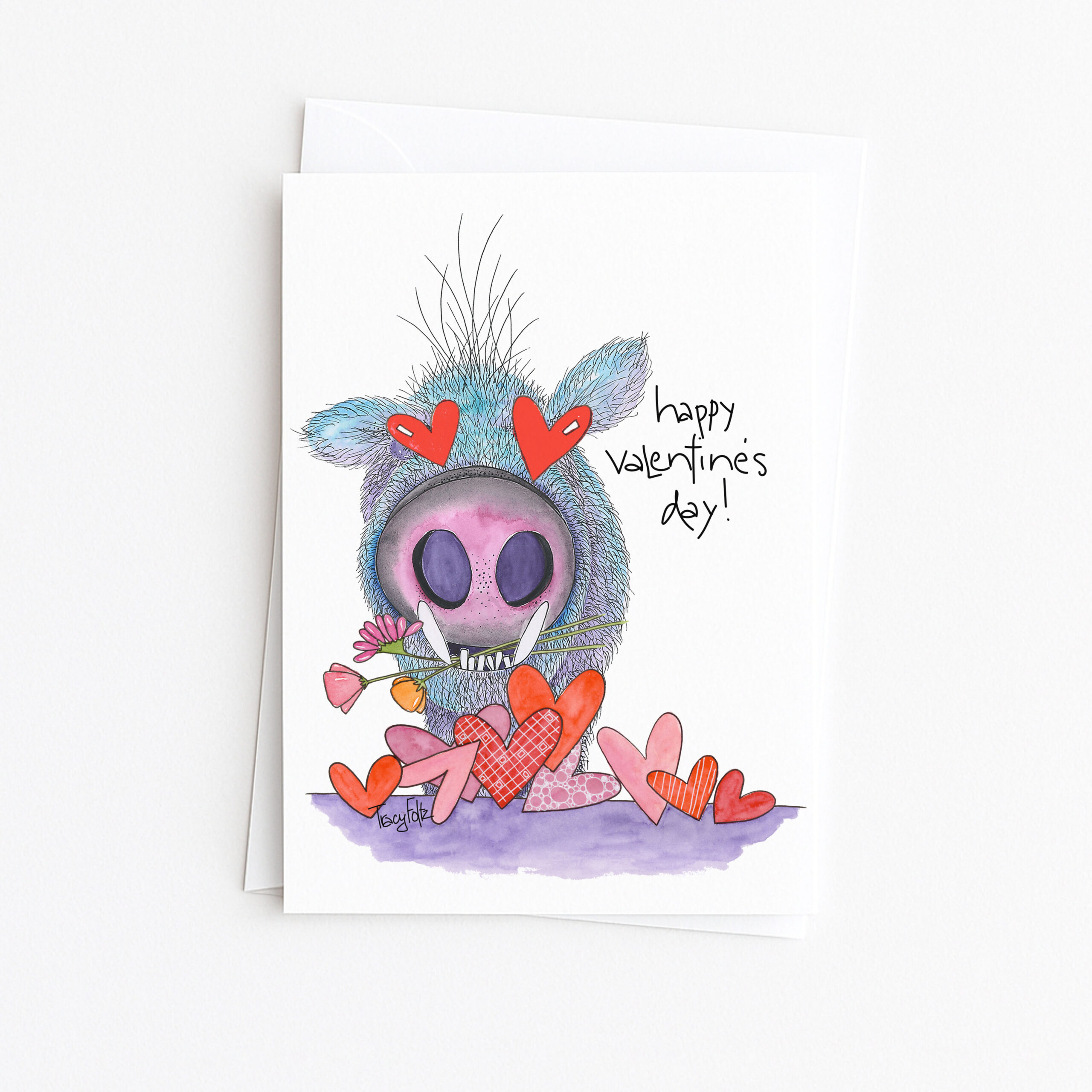 Although javelinas are known for their toughness, this design highlights their softer side. Because of that contrast, the card feels especially endearing and memorable. The heart-filled details add movement and joy, while the expressive eyes draw you right into the moment. At the same time, the purple and teal palette keeps the design playful without overwhelming the scene. As a result, the card feels joyful, modern, and full of love—perfect for anyone who appreciates a little whimsy with their heartfelt messages.