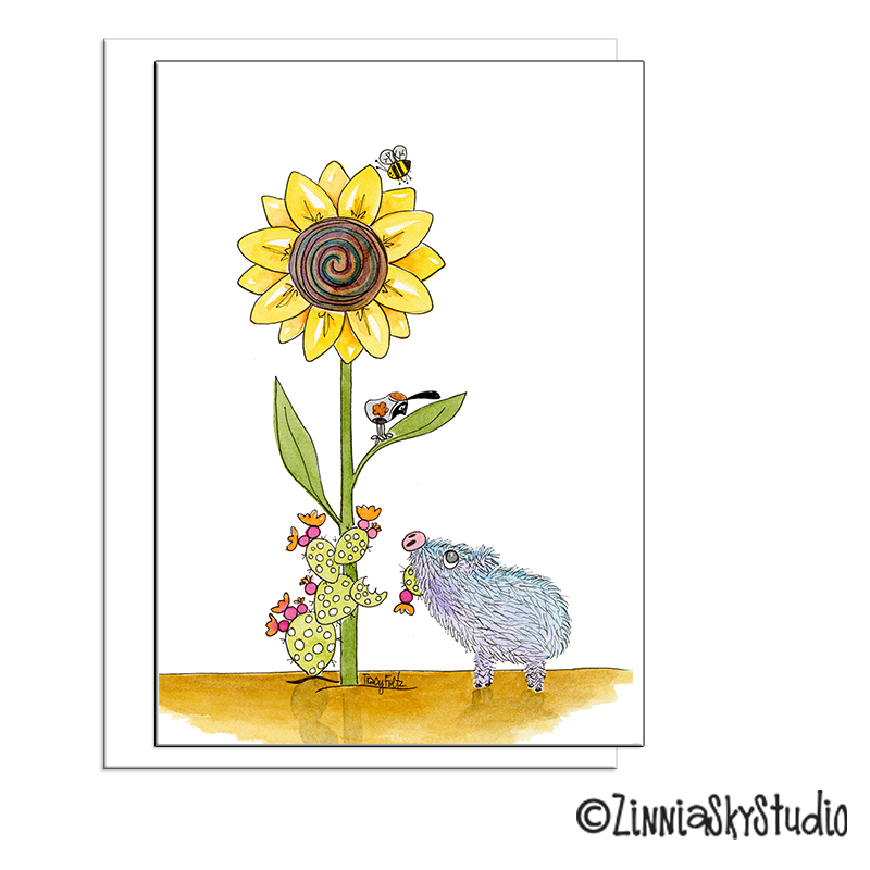 Javelina Funny Pig Sunflower. This funny javelina might be mistaken for a pig but if you’ve been to the desert, you know it’s not. Notorious for eating anything and everything they can find, including nasty, spike cactus, this cute javelina has just realized there’s a big juicy sunflower just above its head. As this javelina pig chews on the favorite delicacy prickly pear, it’s wondering how it can get its teeth sunk into that flower instead. Send a desert smile to someone special. Blank inside because no one says it better than you.