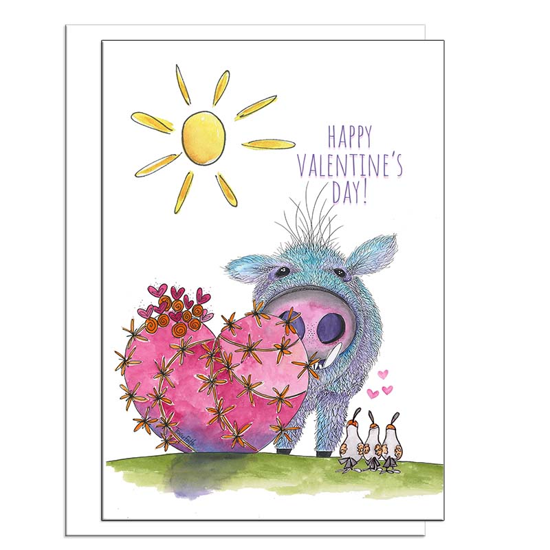 This amazingly colorful javelina is thrilled with this cactus heart Valentine treat from his quail friends. Make your special Valentine just as happy when you send them this happy card from the desert.