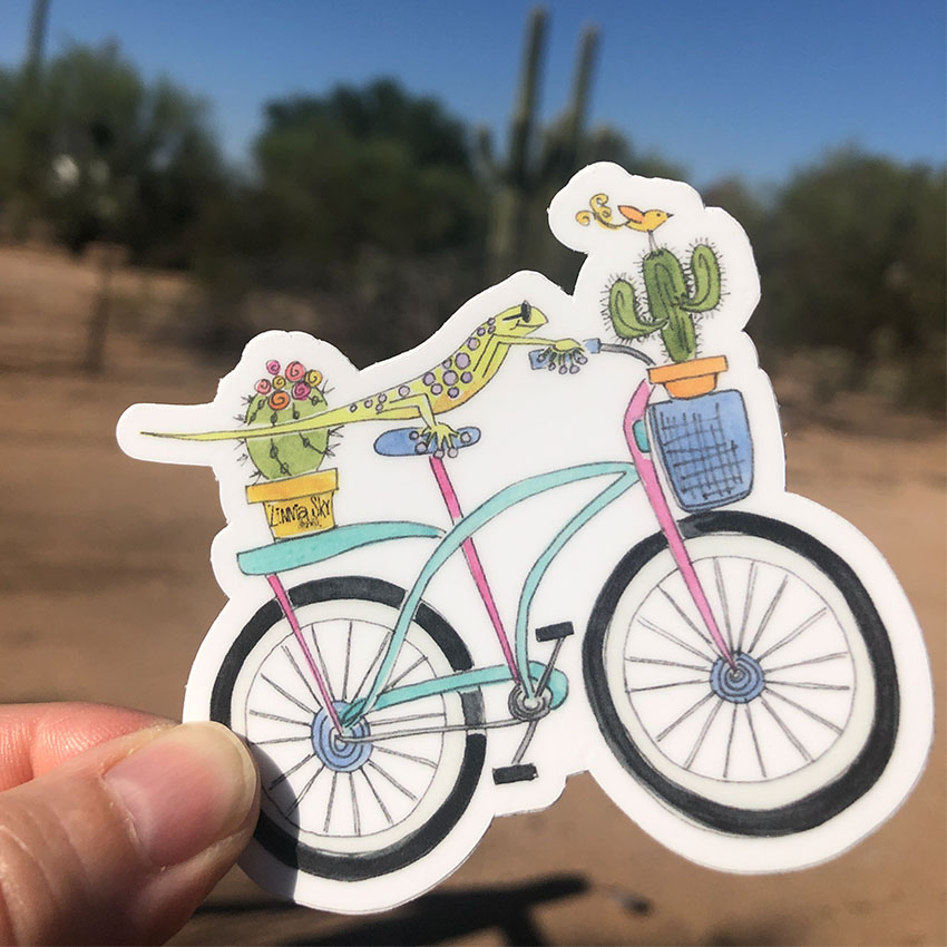 A lizard on a bicycle! Sometimes those short little lizard legs just aren’t fast enough, especially when you have important cargo. Take this ingenius little lizard with you to remind you to think outside the box and have fun doing it! Share the smile with your favorite people – this sticker fits beautifully inside a card and requires no extra postage.