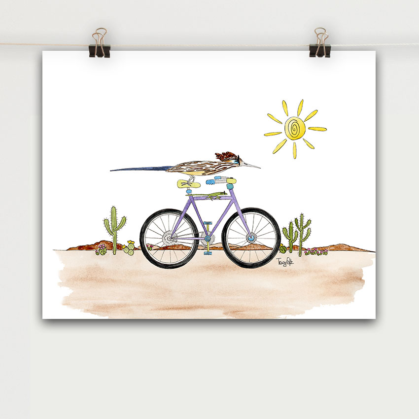 Road Runner Bird Bicycle art print ready to place in your frame and hang on the wall. Make your walls happy!