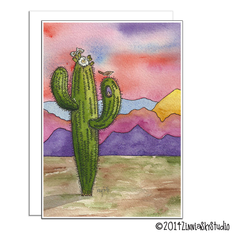 Saguaro cactus and boldly colorful mountains – lots and lots of color! ย Blank inside because no one can say it better than you!