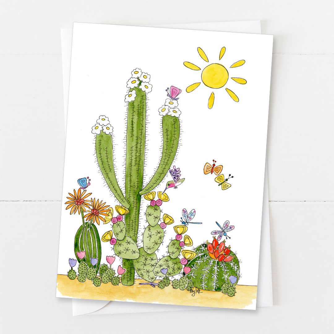 Our Saguaro Happy Garden Blank Card is a vibrant celebration of the desert’s natural beauty. This stunning design features a majestic saguaro cactus surrounded by lots of colorful cacti, with a bright desert sun shining above. A hummingbird flits alongside dragonflies and butterflies, bringing life to the serene desert scene.
