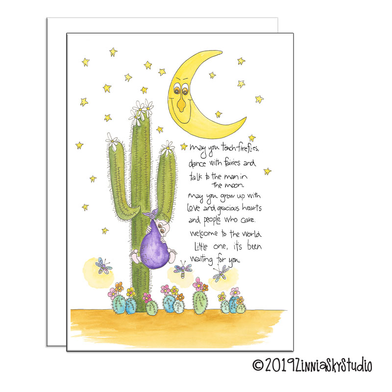 Important things about this Whimsical Saguaro New Baby card: